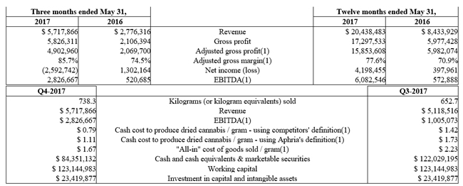 (1) In this press release, reference is made to "all-in" costs to produce dried cannabis per gram, cash costs to produce dried cannabis, cash costs to produce dried cannabis per gram, adjusted gross profit, adjusted gross margin and EBITDA, which are not measures of financial performance under International Financial Reporting Standards. Definitions for all terms above can be found in the Company's May 31, 2017 Management's Discussion and Analysis, filed on SEDAR.