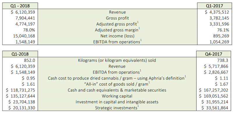 "In the first quarter of 2018, Aphria increased revenue and grams sold, and lowered cash costs, in addition to recording our eighth consecutive quarter of positive EBITDA," said Vic Neufeld, Chief Executive Officer, Aphria. "A key driver of our continued performance has been our ability to maintain leadership as one of the lowest-cost producers in the industry. As legal recreational cannabis comes into market in 2018, low costs per gram will be a critical factor for the entire supply chain. Our proven ability to grow to scale while keeping costs low is an important competitive advantage; it positions Aphria to profitably meet projected demand for cannabis and deliver sustainable value to our shareholders."