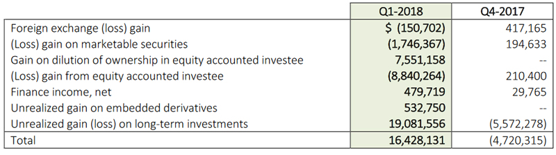 Net income for the three months ended August 31, 2017 was approximately $15 million or $0.11 per share as opposed to a net income of approximately $0.9 million or $0.01 per share in the same quarter in the previous year and a loss of approximately $2.6 million or $0.02 per share in the previous quarter. The increase in net income for Aphria in the quarter is directly related to the net gains on the Company's strategic investment portfolio in the quarter.