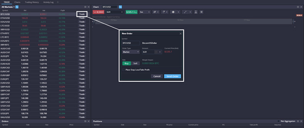 After funding your trading account, it's time to navigate to the trade window by clicking "Trade" on the top navigation bar. You'll be presented with the trade window. Select the BTC/USD pair at the top of the currency pair list and click "Trade".