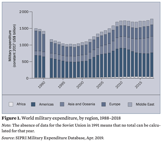 Global defense spending is at a record high. According to a report looking at the 2018 numbers, "Total global spending was up for the second consecutive year, to the highest level since 1988- the first year for which consistent global data is available. And world spending is now 76% higher than the post-cold war low in 1998."
