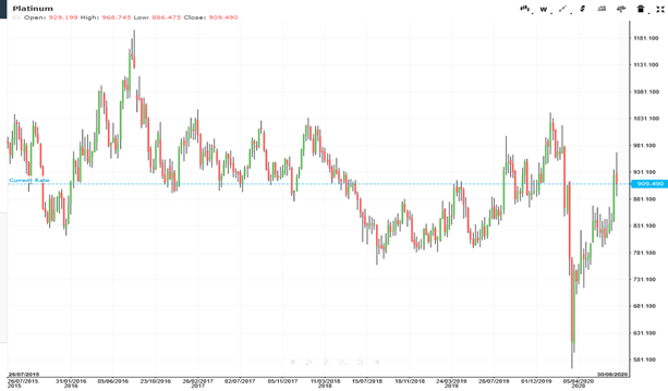 While platinum movements in 2020 did not necessarily track gold's movements, the precious metal did increase - adding 18% between March and July.