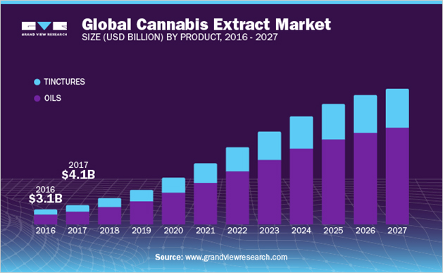 The global cannabis extract market size was valued at USD 7.3 billion in 2019 and is anticipated to register a CAGR of 16.6% over the forecast period to 2027 says Grandview Research.