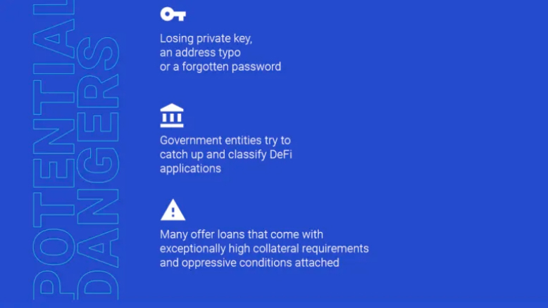 For example, a significant risk for DeFi applications is that many loans come with unusually high collateral requirements, and excessive conditions attached. For example, demanding full liquidation of the pahir means that you lose all your capital if the price of the currency you offer falls below a certain threshold. In addition, there are other risks such as loss of private keys or passwords. There are even very "silly" risks such as typographical errors in your crypto wallet address. That could mean your money will be lost forever.