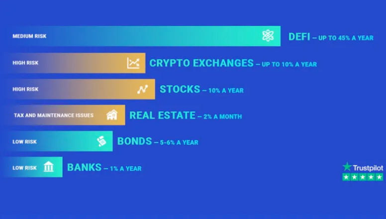 Also, if your money is already in digital currency and is simply being stored in a regular crypto wallet. Then you will earn nothing more while waiting for your currency to appreciate. Conversely, instead, the percentage of your annual return if you invest that cryptocurrency in DeFi applications could be a lot higher. What's more, since the dApps are fully automated, you can earn a steady passive income without wasting time monitoring the markets and managing your portfolio.