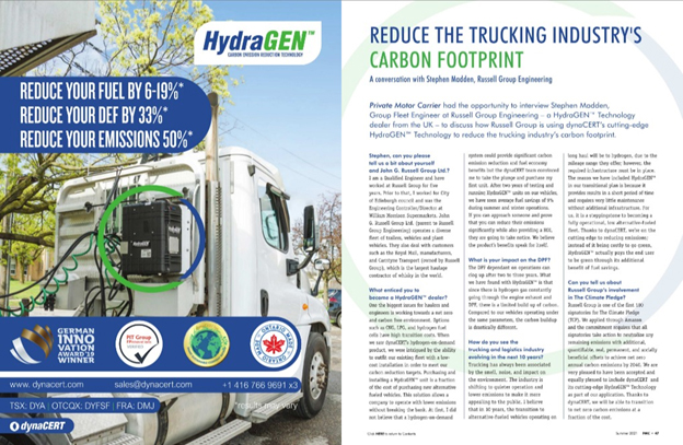 A leading trucking fleet operator in the United Kingdom is using dynaCERT's (TSX:DYA.TO) (OTC: DYFSF) HydraGEN™ advanced technology to achieve net-zero annual carbon emissions in its trucking fleet after experiencing "significant" fuel savings with the device.