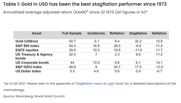 The last period in which the world experienced stagflation was the 1970s. In that time, gold was the best performing asset in the world. According to the World Gold Council, gold remains the best hedge against stagflation. For investors worried about stagflation, gold presents a compelling case for inclusion in their portfolio.