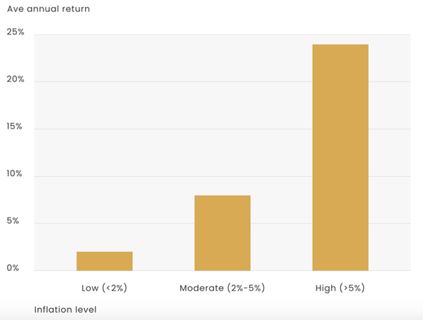 Gold is also a hedge against inflation. In times of inflation, gold tends to do well. Gold is important, then, as a way to diversify your portfolio so that during inflation, when stocks tend to go down, gold will bolster your returns. Research by the World Gold Council shows that when the inflation rate is high, gold tends to have high average annual returns. An inflation rate greater than 5% typically tends to lead to average annual returns of more than 20%.