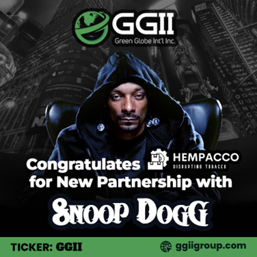 Earlier this month, Hempacco Co., Inc., announced their new joint venture with entertainment icon and entrepreneur Calvin Broadus, Jr. p/k/a "Snoop Dogg" to develop a consumer-packaged goods line. Hempacco is Green Globe InternationaI's majority-owned subsidiary focused on Disrupting Tobacco's™ nearly $1 trillion industry with hemp cigarettes, smoking paper, and other alternatives to nicotine tobacco.