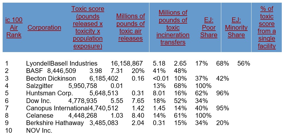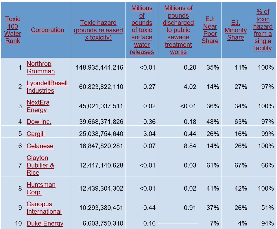 (Click on column headers to re-sort table: current sort is by Toxic 100 Water Rank)