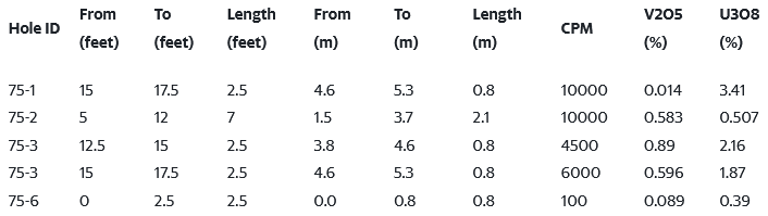 During the data compilation, Dahrouge also evaluated how the historical analytical results compared to surface grab and paleochannel mineralization. As previously highlighted in (March 25, 2024, press release), the field samples from the area of historical drilling returned values of 3.55% U3O8 and 5.34% V2O5. The historical data in conjunction with geological and analytical data collected by Dahrouge, does provide direct insight into potential mineralization on the Property. The results outlined in Table 1, do provide guidance to interpreted mineralized paleochannel and will be used to help guide future drilling campaigns.