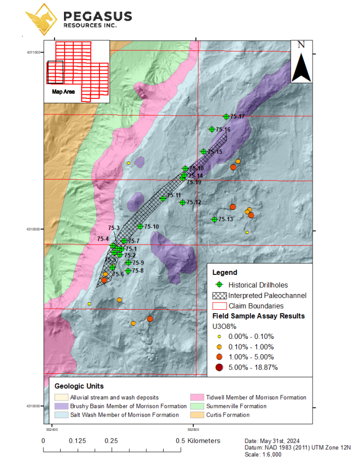 During the generation of the geological model and a Notice of Intent filing, Pegasus was provided with historical drilling data completed on the Property in 1975. This data was inclusive of a drillhole location map, geological logs, downhole geophysical surveys (presented in counts per minute "CPM") and interval analytical values for uranium and vanadium from eleven (11) drillholes. Dahrouge completed a data compilation and review of the geological logs and drilling location map to evaluate their consistency to what was observed in the field during the mapping campaign. The drillhole map was then georeferenced based on available data, such as topography and state plain section corner, to determine relative historical drillhole locations (Figure 1). The historical drillholes have been overlain on the preliminary geological model to evaluate consistency of the historical logs to the detailed mapping completed during Q1 2024.