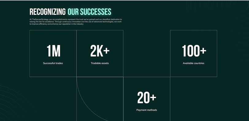 The platform is recognized for its steadfast dedication to innovation, efficiency, and excellence. Trusted by traders globally, TheSuccesStrategy.com is available in over 100 countries, with an impressive record of 1 million successful trades and access to more than 2,000 tradable assets. This track record, combined with over 20 payment methods, demonstrates the platform's commitment to accessibility and convenience.